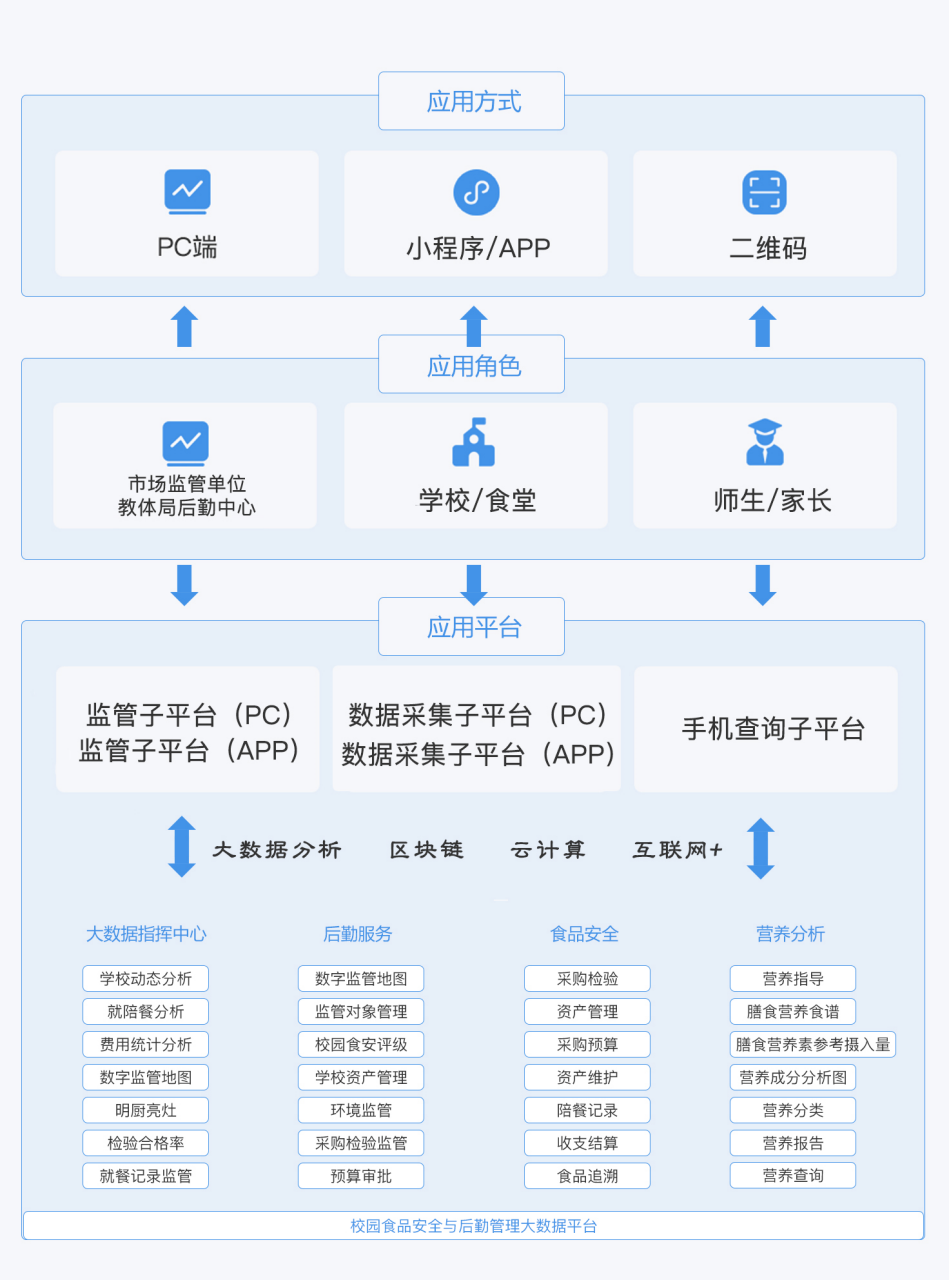 北京天航質(zhì)誠(chéng)科技有限公司依托數(shù)千家食品企業(yè)應(yīng)用經(jīng)驗(yàn),結(jié)合陜西省某市校園食品安全保障工作和校園后勤服務(wù)工作的實(shí)際情況,充分利用云計(jì)算、互聯(lián)網(wǎng)+、大數(shù)據(jù)、GIS等技術(shù)手段,以“互聯(lián)網(wǎng)+食品安全追溯+后勤管理”為業(yè)務(wù)主線,推出了面向大中小學(xué)幼托園所的“食品安全追溯與后勤監(jiān)管大數(shù)據(jù)云平臺(tái)”,