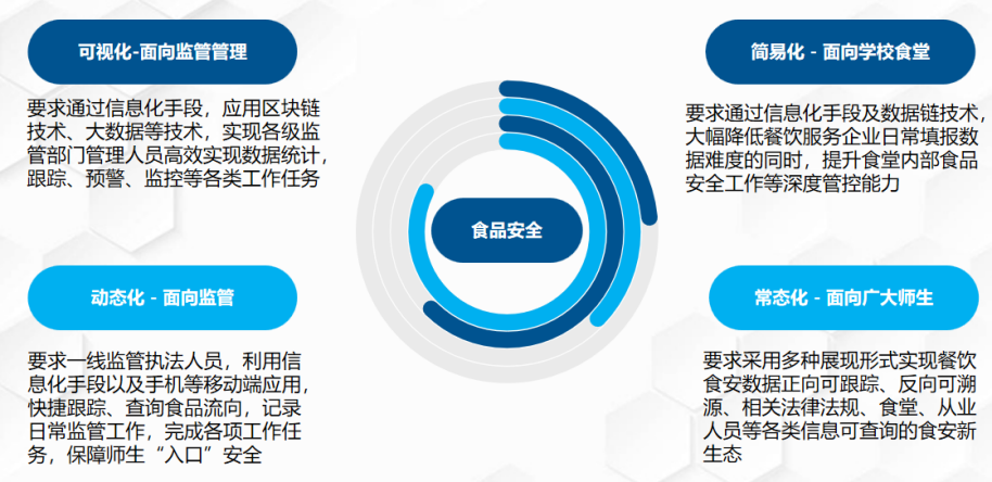 希望以此為基礎(chǔ),強(qiáng)化學(xué)校食堂管理者主體責(zé)任和監(jiān)管部門監(jiān)督責(zé)任,實(shí)現(xiàn)一個(gè)平臺(tái)完成多項(xiàng)工作的建設(shè)目標(biāo),全面提升信息化工作能力,切實(shí)保障學(xué)生用餐安全和身體健康。