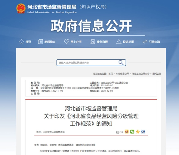 據(jù)河北省市場監(jiān)督管理局消息,為強(qiáng)化食品經(jīng)營風(fēng)險(xiǎn)管理,科學(xué)有效實(shí)施監(jiān)管,切實(shí)提高食品安全監(jiān)管效能和水平,日前,河北省市場監(jiān)督管理局正式印發(fā) 《河北省食品經(jīng)營風(fēng)險(xiǎn)分級管理工作規(guī)范》(以下簡稱《工作規(guī)范》),對食品經(jīng)營環(huán)節(jié)風(fēng)險(xiǎn)分級管理工作統(tǒng)一進(jìn)行規(guī)范。
