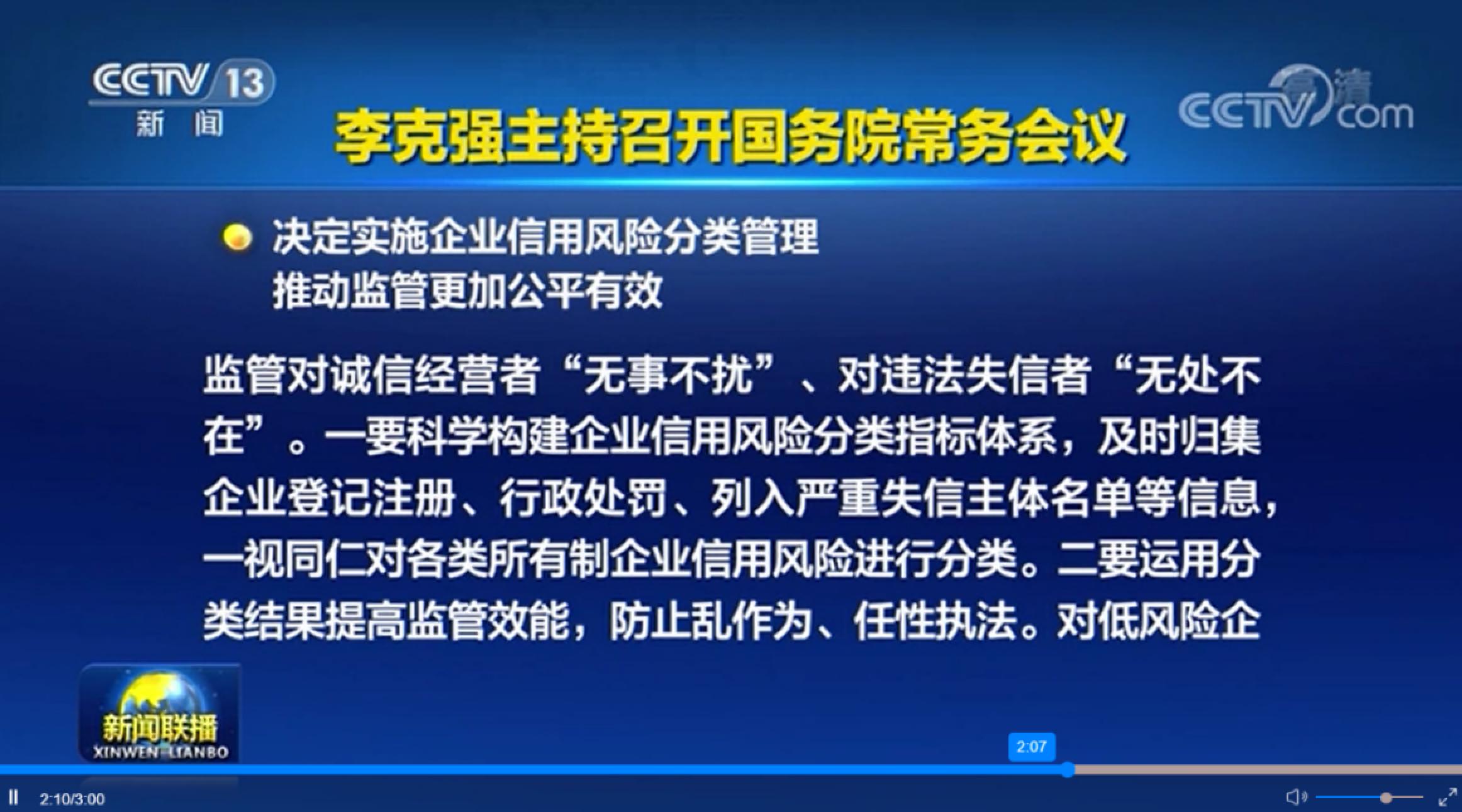會(huì)議指出,信用是市場(chǎng)經(jīng)濟(jì)的基礎(chǔ)。為營(yíng)造誠(chéng)實(shí)守信、公平競(jìng)爭(zhēng)市場(chǎng)環(huán)境,要依法依規(guī)推進(jìn)企業(yè)信用風(fēng)險(xiǎn)分類管理,相應(yīng)采取“雙隨機(jī)、一公開”等科學(xué)精準(zhǔn)的監(jiān)管措施,使監(jiān)管對(duì)誠(chéng)信經(jīng)營(yíng)者“無(wú)事不擾”、對(duì)違法失信者“無(wú)處不在”。